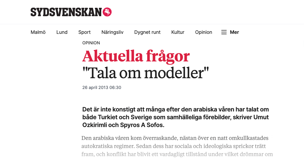 interview with Journal Europa http://www.journaleuropa.info/Formats/Magazines/36-Printemps-2013/Entrevue-Spyros-Sofos Spyros Sofos, professeur de sciences politiques à Lund, commune de la même région, et auteur de divers essais sur l’Islam, le nationalisme et l’Europe, nous explique les raison et les conséquences de l’islamophobie grandissante dans la localité de Malmö. Qu’est-ce qu’être musulman? Tout d’abord être musulman signifie tellement de choses différentes ! L’Etat Suédois a une vision très restreinte de ce qu’est être musulman. En effet, à Malmö les populations dites “musulmanes” viennent d’Iraq, de Bosnie, du Liban, d’Iran, de Turquie, d’Afghanistan, de Somalie ou du Pakistan. Ranger toutes ces communautés dans un seul bloc appelé “musulman” est erroné : il existe des musulmans très pratiquants et d’autres beaucoup plus séculaires, comme les Bosniaques. En fait, certains jeunes ne sont même pas pratiquants du tout, mais leurs parents le sont, on peut dire qu’ils sont culturellement musulmans.