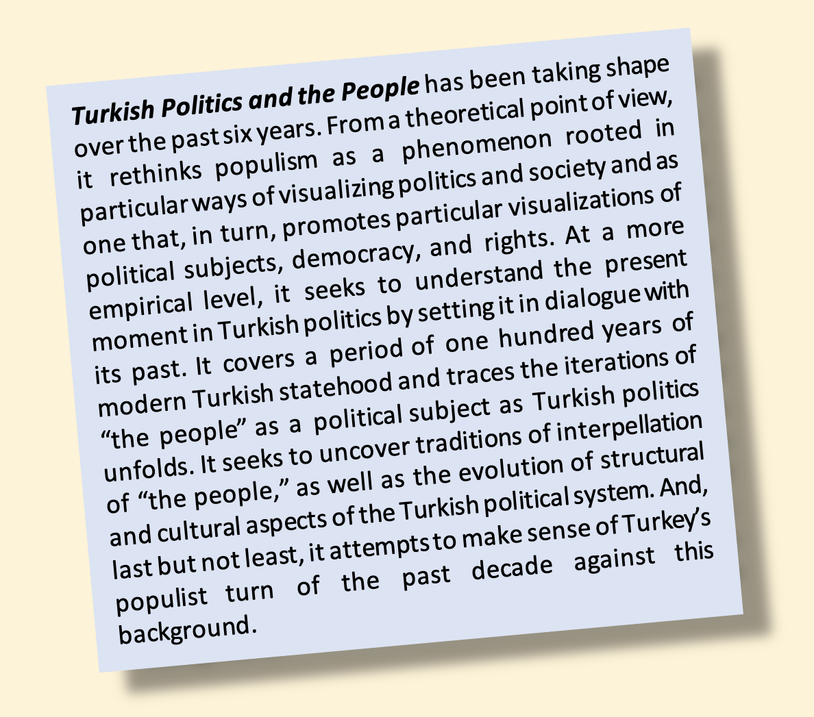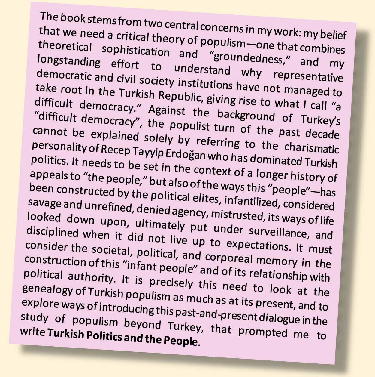 This is an impressive volume, one that documents that while much has changed in Turkey over the past century, the country has come “full circle” (p. 218) with respect to democratization and state-society relations. Although it covers some well-trodden ground, it weaves together a consistent and powerful narrative on how discourse regarding “the people” has been systematically used and abused by politicians that is fundamental to understand the limitations of Turkey’s democratic development … there is no doubt this is a rich work and an impressive piece of scholarship, one that deserves and will acquire a wide readership among those interested in Turkey’s political development. – Paul Kubicek, Turkish Studies