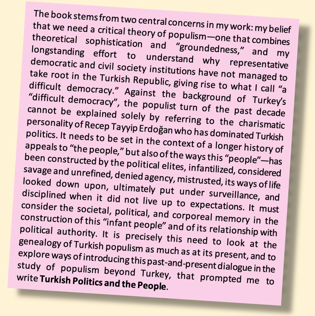 Spyros Sofos’s book, Turkish Politics and ‘The People’: Mass Mobilisation and Populism, emerges as a compelling interdisciplinary work historicizing populism in modern Turkey. While earlier works traced populism in Turkey back to the early years of the republic focusing on the infamous center-periphery cleavage, Sofos goes beyond this cleavage to explain how populism actually emerged in the country. In this regard, Sofos’s meticulous examination of the uses and constructions of “the people” from the establishment of the Republic of Turkey in 1923 until the present serves as a pivotal framework for understanding the dynamics of populism within Turkish politics. – Selin Bengi Gumrukcu, Journal of the Ottoman and Turkish Studies Association
